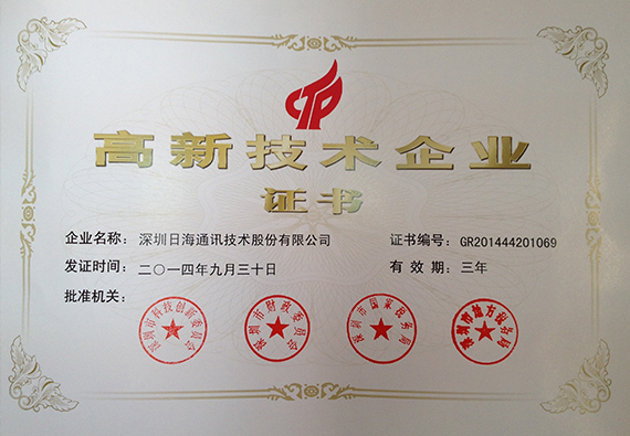 2012年3月25日,公司全资子公司深圳市海生机房技术有限公司被认定为“国家级高新技术企业”称号。